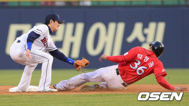 9일 오후 서울 잠실구장에서 열린 '2014 한국야쿠르트 세븐 프로야구' 두산 베어스와 SK 와이번스의 경기 1회초 2사 1루 나주환 타석, 1루주자 박정권이 도루에 실패하고 있다.