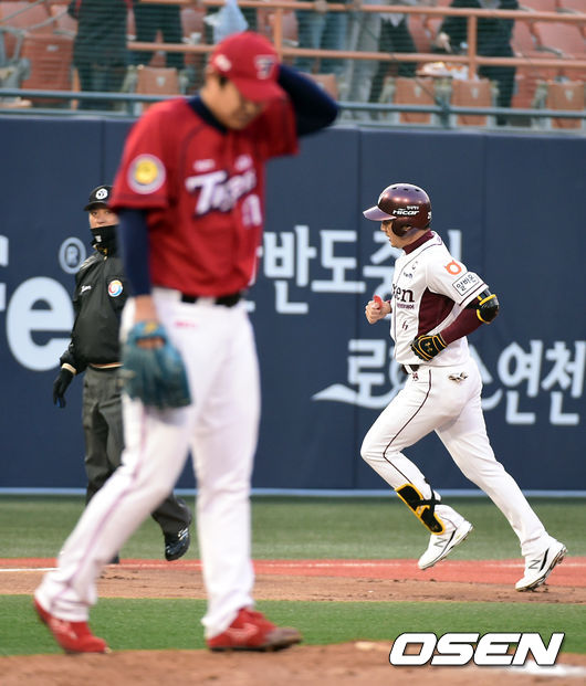 9일 목동 야구장에서 벌어진 2014 한국프로야구 넥센 히어로즈와 KIA 타이거즈의 경기 1회말 무사 1루서 이택근이 투런 홈런을 치고 베이스를 돌고 있다.