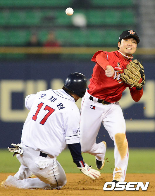 9일 오후 서울 잠실구장에서 열린 '2014 한국야쿠르트 세븐 프로야구' 두산 베어스와 SK 와이번스의 경기 4회말 무사 1루 김현수의 병살타를 김성현이 2루에서 오재원을 포스아웃 시킨 후 1루로 송구하고 있다.