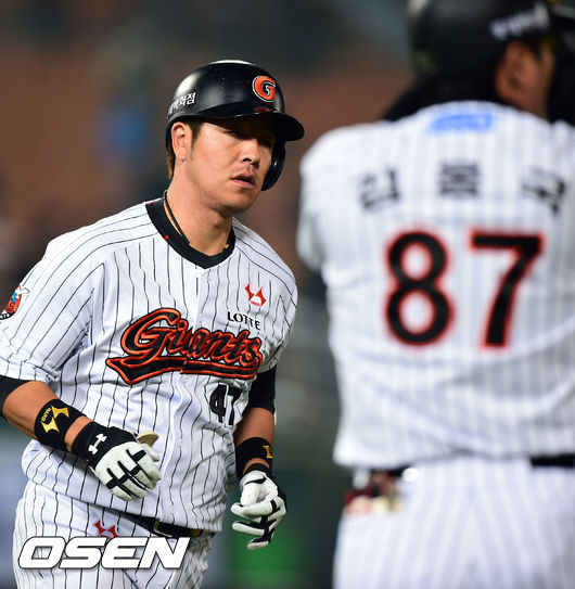 9일 오후 부산 사직구장에서 열린 '2014 한국야쿠르트 세븐 프로야구' 롯데 자이언츠와 LG 트윈스의 경기, 4회말 2사 2루 롯데 강민호가 2점 홈런을 날리고 베이스를 돌고 있다.