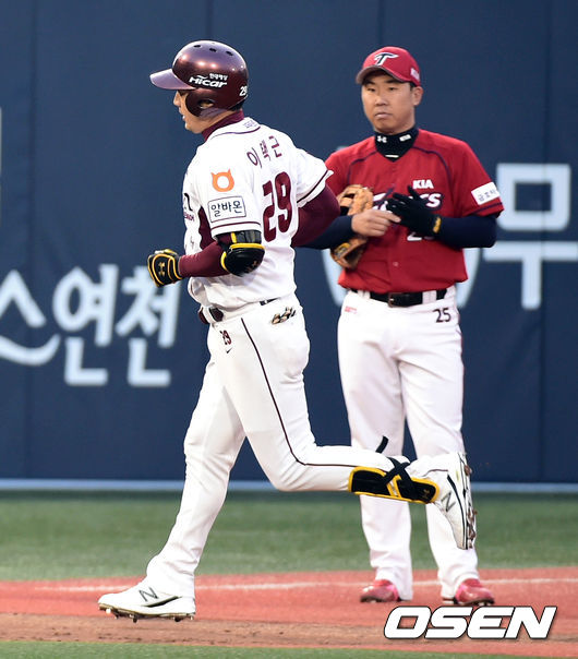 9일 목동 야구장에서 벌어진 2014 한국프로야구 넥센 히어로즈와 KIA 타이거즈의 경기 1회말 무사 1루 이택근이 투런 홈런을 치고 베이스를 돌고 있다.