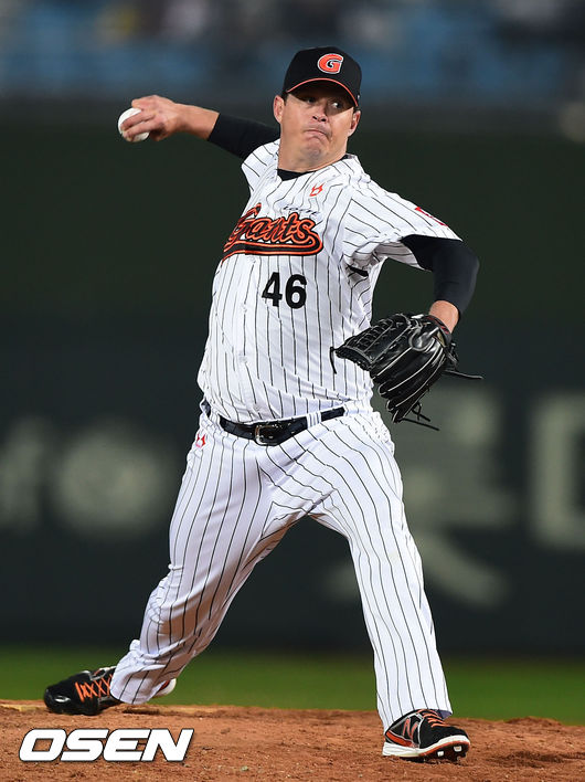 9일 오후 부산 사직구장에서 열린 '2014 한국야쿠르트 세븐 프로야구' 롯데 자이언츠와 LG 트윈스의 경기, 5회초 롯데 선발투수 옥스프링이 역투하고 있다.
