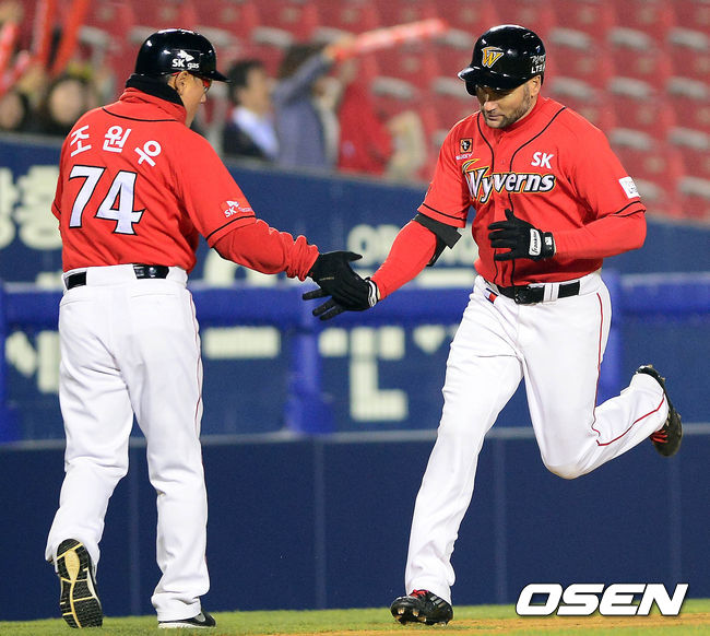 9일 오후 서울 잠실구장에서 열린 '2014 한국야쿠르트 세븐 프로야구' 두산 베어스와 SK 와이번스의 경기 6회초 선두타자 스캇이 솔로포를 치고 조원우 코치와 하이파이브를 하고 있다.