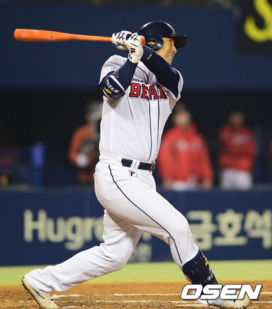 9일 오후 서울 잠실구장에서 열린 '2014 한국야쿠르트 세븐 프로야구' 두산 베어스와 SK 와이번스의 경기 6회말 2사 3루 김현수가 1타점 2루타를 치고 있다