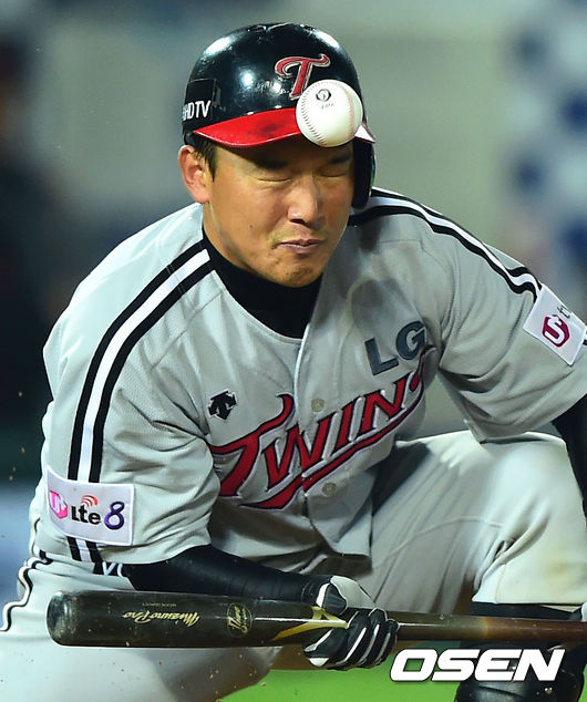 9일 오후 부산 사직구장에서 열린 '2014 한국야쿠르트 세븐 프로야구' 롯데 자이언츠와 LG 트윈스의 경기,7회초 무사 1루 LG 윤요섭이 번트타구에 맞고 있다.