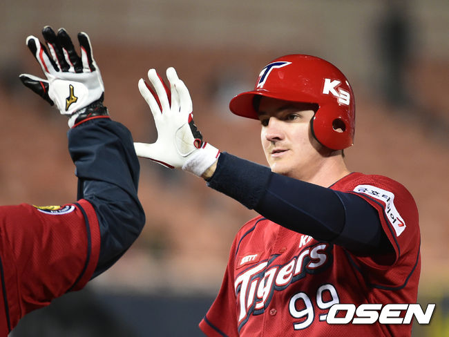 9일 목동 야구장에서 벌어진 2014 한국프로야구 넥센 히어로즈와 KIA 타이거즈의 경기 7회초 무사 1,2루 필이 적시타를 치고 좋아하고 있다.