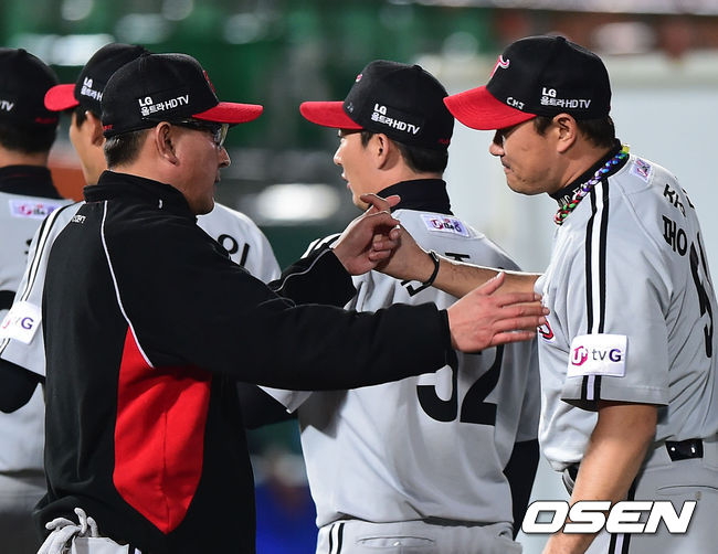 경기종료 후 LG 김기태 감독이 시즌 첫 세이브를 거둔 봉중근과 손가락 하이파이브를 하고 있다./ soul1014@osen.co.kr