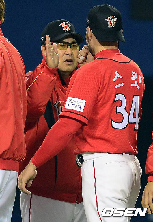 9일 오후 서울 잠실구장에서 열린 '2014 한국야쿠르트 세븐 프로야구' 두산 베어스와 SK 와이번스의 경기 종료 후 이만수 감독과 스캇이 하이파이브를 하고 있다.