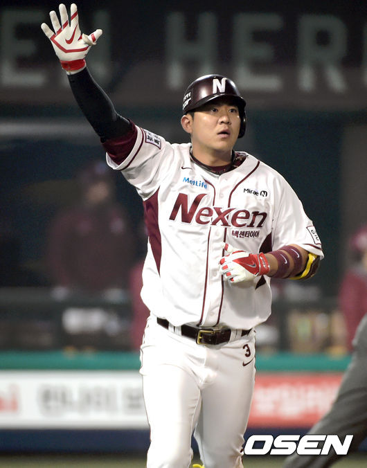 9일 목동 야구장에서 벌어진 2014 한국프로야구 넥센 히어로즈와 KIA 타이거즈의 경기 8회말 1사 1루 김민성이 투런 홈런을 치고 좋아하고 있다.