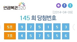 9일 추첨한 제145회 '연금복권520' 1등 당첨번호는 '5조975153'과 '7조457556'이다.