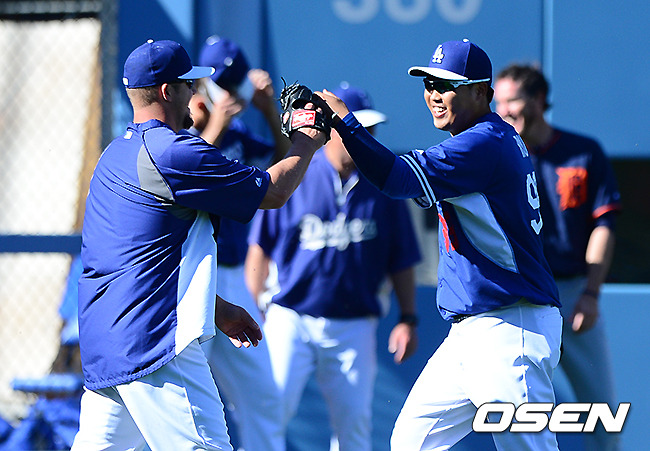 경기에 앞서 다저스 류현진이 폴 마홈과 캐치볼을 마치고 인사를 하고 있다.