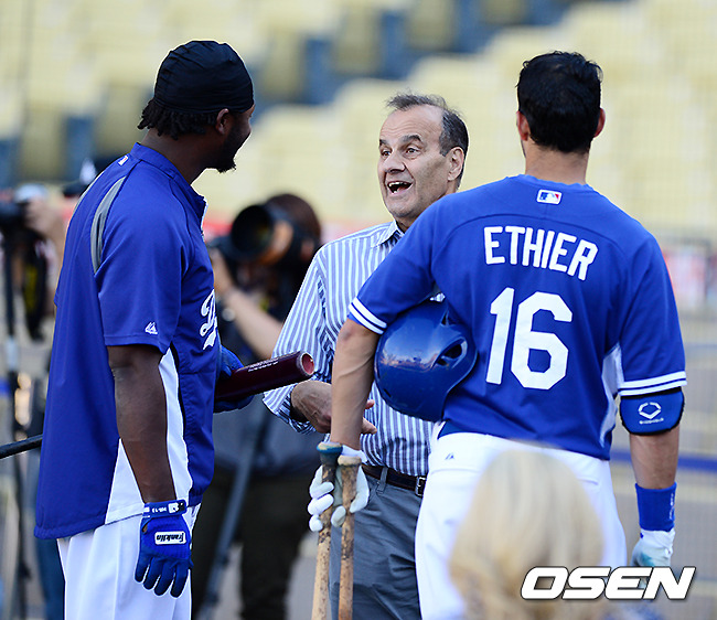 경기에 앞서 조 토리 메이저리그 부사장이 다저스 라미레즈, 이디어와 이야기를 나누고 있다.