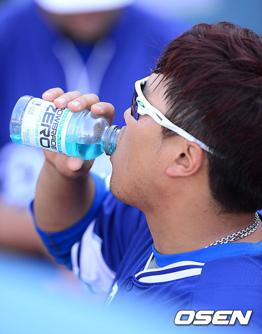 경기에 앞서 다저스 류현진이 타격 훈련을 마치고 음료를 마시고 있다.