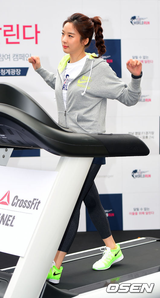 이청아가 러닝머신을 달리고 있다.