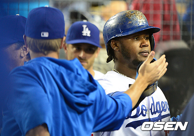1회말 2사 3루에서 다저스 라미레즈가 이디어의 내야땅볼에 홈을 밟고 더그아웃에서 기뻐하고 있다.