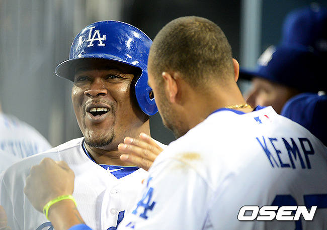 2회말 1사 3루에서 다저스 유리베가 베켓의 스퀴즈 번트로 홈을 밟고 더그아웃에서 켐프와 기뻐하고 있다.
