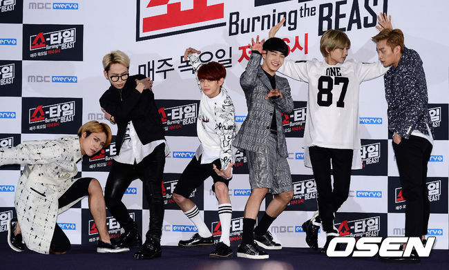 10일 오후 서울 여의도 IFC몰 CGV에서 진행된 MBC에브리원 '쇼타임 버닝더 비스트' 제작발표회에서 비스트가 포토타임을 갖고 있다.