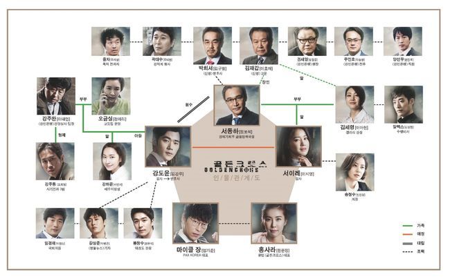 '골든크로스'는 10일 등장 인물 소개와 함께 인물 간의 관계를 설명하는 인물 관계도를 공개했다. 인물 관계도에서 가장 눈에 띄는 것은 관계도의 중심축을 차지하고 있는 '강도윤(김강우 분)-서이레(이시영 분)-서동하(정보석 분)' 세 사람. 강도윤, 서이레 사이의 '애정', 강도윤, 서동하 사이의 '원수' 그리고 서동하, 서이레 사이의 '가족'이라는 관계가 향후 펼쳐질 이들의 엇갈린 운명을 예고한다.