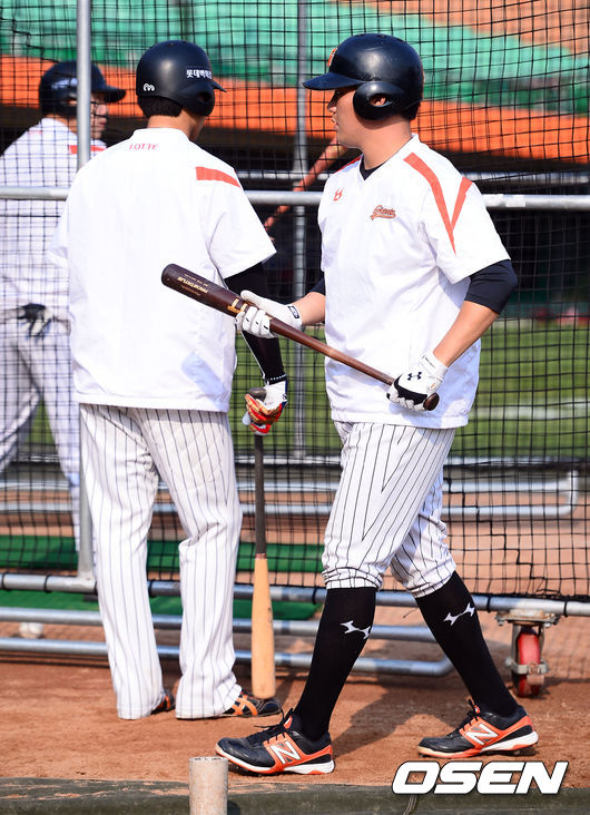 10일 오후 부산 사직구장에서 열린 '2014 한국야쿠르트 세븐 프로야구' 롯데 자이언츠와 LG 트윈스의 경기에 앞서 롯데 장성우가 배팅훈련을 마치고 걸어가고 있다.