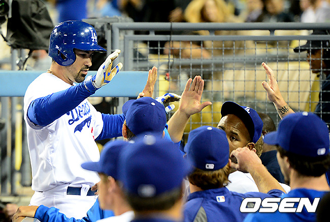9회말 무사에서 다저스 곤잘레스가 솔로포를 날리고 더그아웃에서 동료선수들과 기뻐하고 있다. / jpnews@osen.co.kr