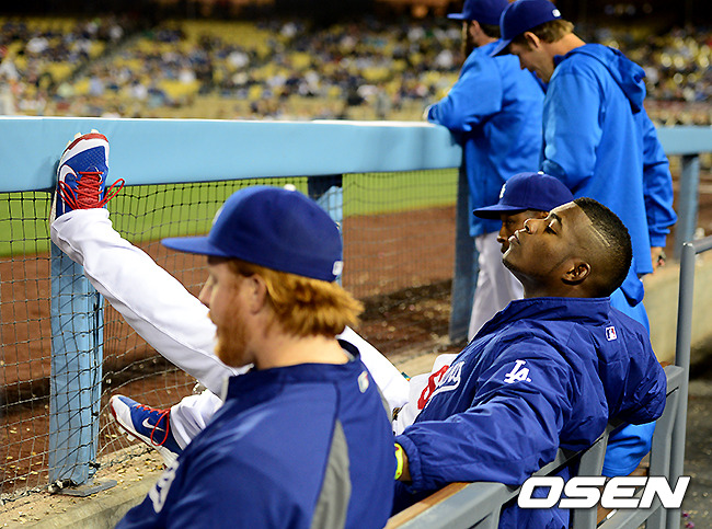 8회초 다저스 푸이그가 더그아웃에서 경기를 지켜보고 있다. / jpnews@osen.co.kr