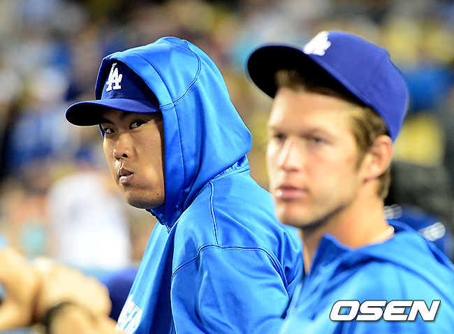 다저스 류현진과 커쇼가 더그아웃에서 경기를 지켜보고 있다. / jpnews@osen.co.kr