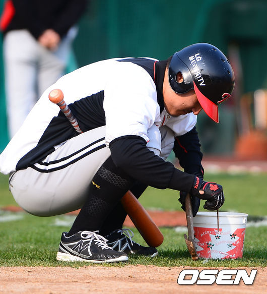 10일 오후 부산 사직구장에서 열린 '2014 한국야쿠르트 세븐 프로야구' 롯데 자이언츠와 LG 트윈스의 경기에 앞서 LG 이진영이 구장 공구통에 있던 못으로 못질하고 있다.
