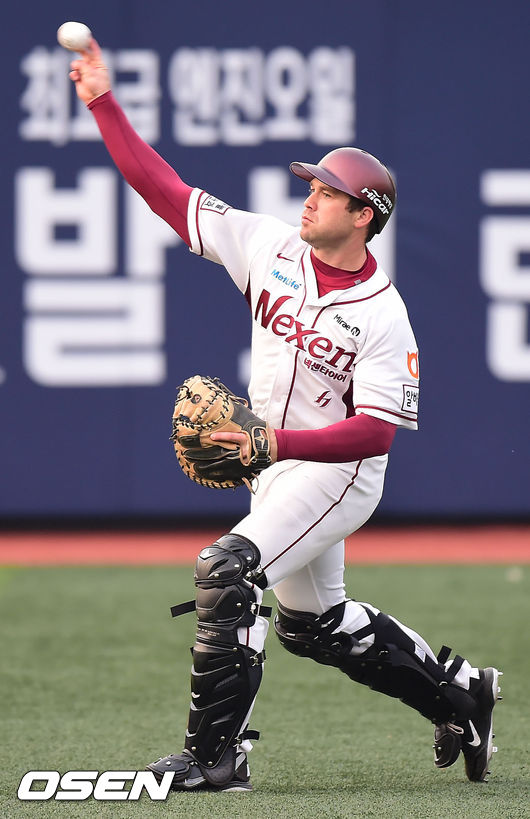 10일 목동 야구장에서 벌어진 2014 한국프로야구 넥센 히어로즈와 KIA 타이거즈의 경기, 경기 전 오늘 경기에서 포수로 나오는 넥센 로티노가 포수 장비를 입고 연습을 하고 있다.
