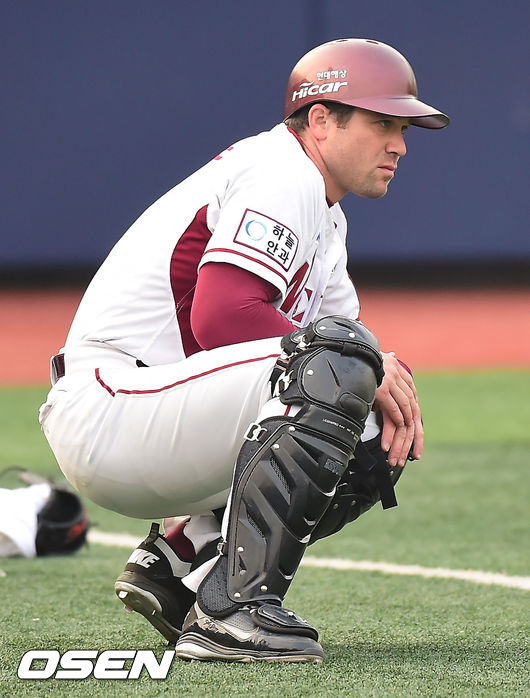 10일 목동 야구장에서 벌어진 2014 한국프로야구 넥센 히어로즈와 KIA 타이거즈의 경기, 경기 전 오늘 경기에서 포수로 나오는 넥센 로티노가 포수 장비를 입고 연습을 하고 있다.