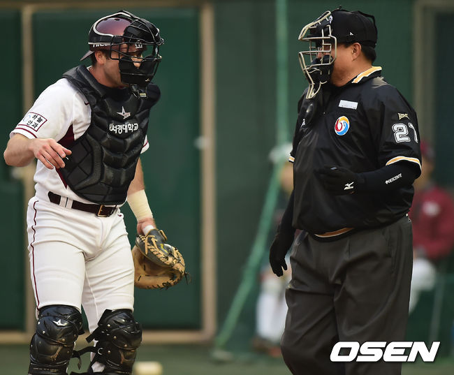 10일 목동 야구장에서 벌어진 2014 한국프로야구 넥센 히어로즈와 KIA 타이거즈의 경기, 1회초 1사 주자 1,2루 KIA 나지완 타석에서 2루 주자 김주찬이 3루 도루에 성공했을때 넥센 로티노 포수가 최수원 주심에게 항의하고 있다.