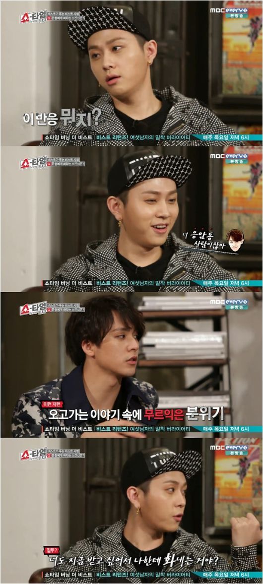 손동운은 10일 첫 방송된 MBC에브리원 예능프로그램 ‘쇼타임-버닝 더 비스트’에서 “준형이 형이 술에 취해 내 입술에 뽀뽀를 했다”고 말을 했다.