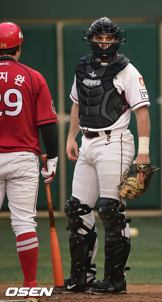 10일 목동 야구장에서 벌어진 2014 한국프로야구 넥센 히어로즈와 KIA 타이거즈의 경기, 1회초 1사 주자 1,3루 KIA 나지완 타석에서 넥센 포수 로티노가 최수원 주심에게 항의한 후 덕아웃의 사인을 보고 있다.