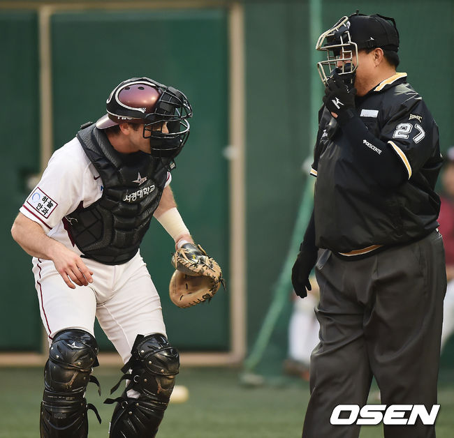 10일 목동 야구장에서 벌어진 2014 한국프로야구 넥센 히어로즈와 KIA 타이거즈의 경기, 1회초 1사 주자 1,2루 KIA 나지완 타석에서 2루 주자 김주찬이 3루 도루에 성공했을때 넥센 로티노 포수가 최수원 주심에게 항의하고 있다.