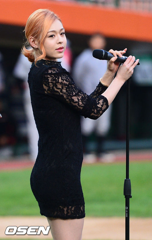 10일 오후 부산 사직구장에서 열린 '2014 한국야쿠르트 세븐 프로야구' 롯데 자이언츠와 LG 트윈스의 경기에 앞서 걸그룹 배드키즈 모니카가 애국가를 부르고 있다.