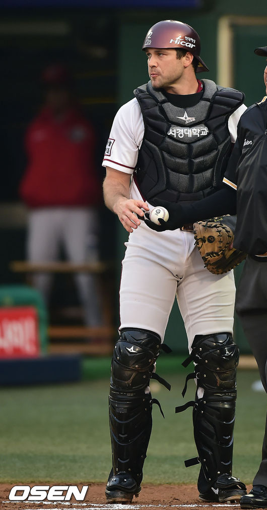 10일 목동 야구장에서 벌어진 2014 한국프로야구 넥센 히어로즈와 KIA 타이거즈의 경기, 넥센 포수 로티노가 밴헤켄을 바라보고 있다.