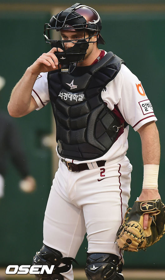 10일 목동 야구장에서 벌어진 2014 한국프로야구 넥센 히어로즈와 KIA 타이거즈의 경기, 넥센 포수 로티노가 포수 마스크를 착용하고 있다.