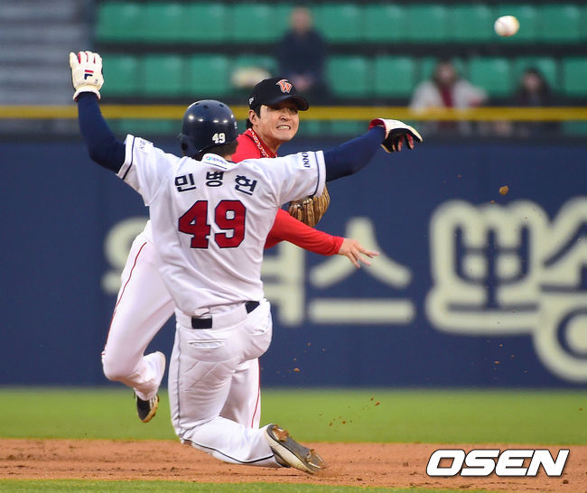 10일 오후 서울 잠실야구장에서 열린 '2014 한국야쿠르트 세븐 프로야구' 두산 베어스와 SK 와이번스의 경기, 1회말 무사 1루 SK 김성현이 두산 고영민의 내야 땅볼 타구때 1루주자 민병헌을 포스아웃으로 잡아낸 뒤 1루로 송구하고 있다.