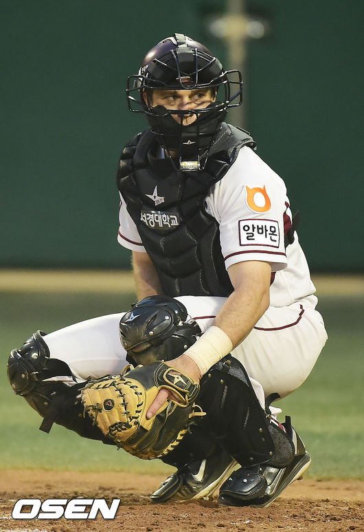 10일 목동 야구장에서 벌어진 2014 한국프로야구 넥센 히어로즈와 KIA 타이거즈의 경기, 2회초 넥센 포수 로티노가 덕아웃쪽을 바라보며 밴헤켄에게 사인을 보내고 있다.