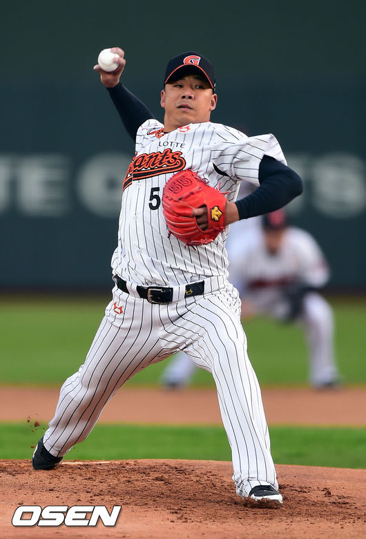 10일 오후 부산 사직구장에서 열린 '2014 한국야쿠르트 세븐 프로야구' 롯데 자이언츠와 LG 트윈스의 경기, 1회초 롯데 선발투수 김사율이 역투하고 있다