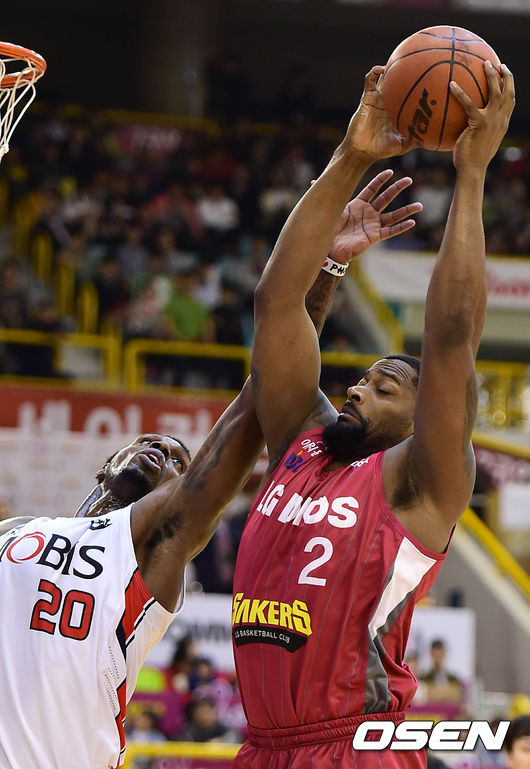 1쿼터 LG 제퍼슨이 메시와 모비스 라틀리프가 리바운드 다툼을 하고 있다.