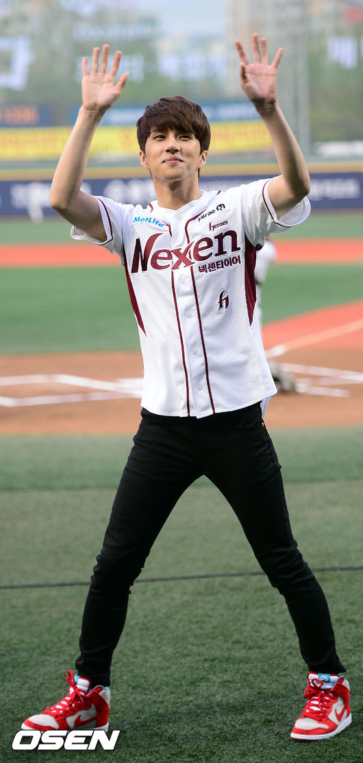 10일 목동 야구장에서 벌어진 2014 한국프로야구 넥센 히어로즈와 KIA 타이거즈의 경기, 경기 전 빅스의 켄이 애국가를 부른 후 인사를 하고 있다.