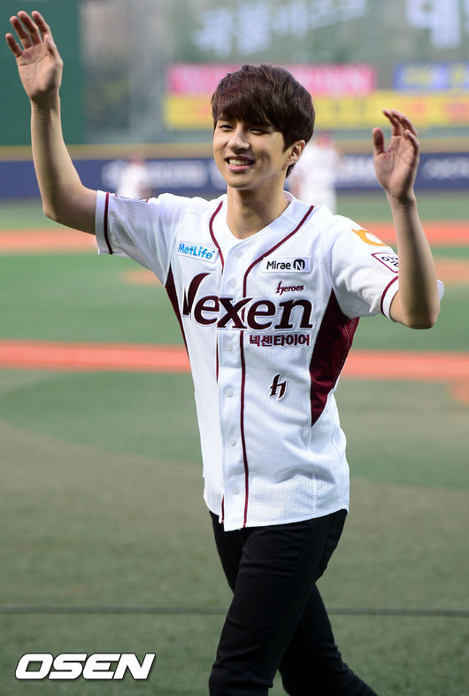 10일 목동 야구장에서 벌어진 2014 한국프로야구 넥센 히어로즈와 KIA 타이거즈의 경기, 경기 전 빅스의 켄이 애국가를 부른 후 인사를 하고 있다.