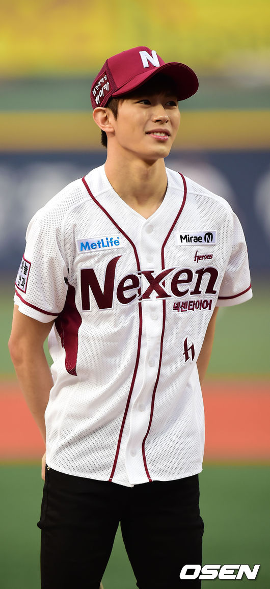 10일 목동 야구장에서 벌어진 2014 한국프로야구 넥센 히어로즈와 KIA 타이거즈의 경기, 경기 전 빅스의 홍빈이 시타를 마친 후 미소지으며 인사하고 있다.