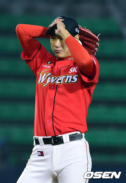 10일 오후 서울 잠실야구장에서 열린 '2014 한국야쿠르트 세븐 프로야구' 두산 베어스와 SK 와이번스의 경기, 4회말 2사 만루 SK 김광현이 두산 김재호를 상대로 던진 3구가 볼 판정을 받자 아쉬워하고 있다.