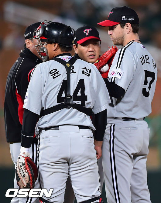 10일 오후 부산 사직구장에서 열린 '2014 한국야쿠르트 세븐 프로야구' 롯데 자이언츠와 LG 트윈스의 경기,6회말 LG 선발투수 리오단이 강상수 투수코치와 이야기를 나누고 있다.