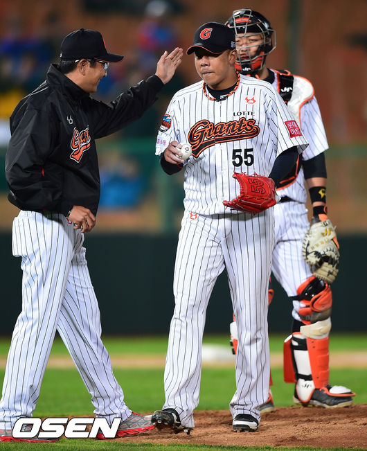 10일 오후 부산 사직구장에서 열린 '2014 한국야쿠르트 세븐 프로야구' 롯데 자이언츠와 LG 트윈스의 경기,7회초 롯데 선발투수 김사율이 교체되고 있다.