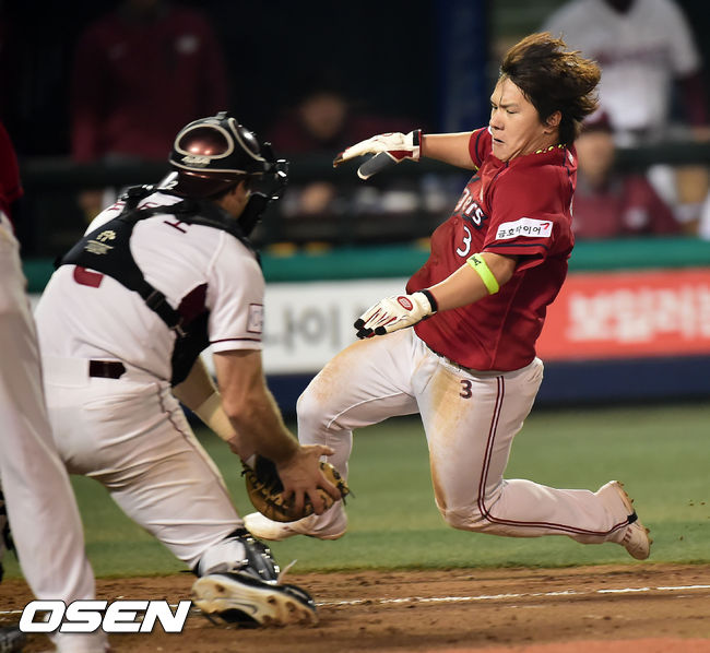 10일 목동 야구장에서 벌어진 2014 한국프로야구 넥센 히어로즈와 KIA 타이거즈의 경기, 7회초 1사 주자 2루 KIA 차일목 타석에서 2루 주자 김선빈이 3루 도루에 성공했을때 송구가 빠지자 홈으로 몸을 날리고 있다. 그러나 KIA 김선빈은 넥센 로티노 포수에게 태그아웃을 당하고 있다.