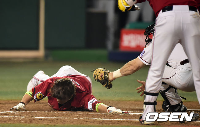 10일 목동 야구장에서 벌어진 2014 한국프로야구 넥센 히어로즈와 KIA 타이거즈의 경기, 7회초 1사 주자 2루 KIA 차일목 타석에서 2루 주자 김선빈이 3루 도루에 성공했을때 송구가 빠지자 홈으로 몸을 날리고 있다. 그러나 KIA 김선빈은 넥센 로티노 포수에게 태그아웃을 당하고 있다.