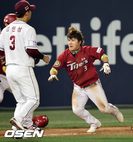 10일 목동 야구장에서 벌어진 2014 한국프로야구 넥센 히어로즈와 KIA 타이거즈의 경기, 7회초 1사 주자 2루 KIA 차일목 타석에서 2루 주자 김선빈이 3루 도루에 성공했을때 송구가 빠지자 홈으로 달리고 있다.