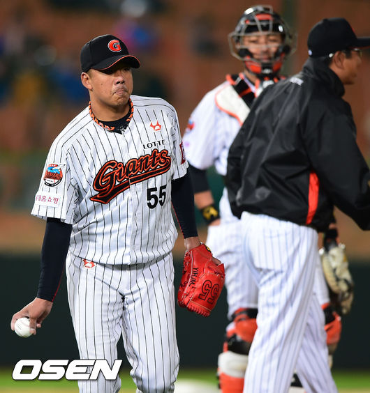 10일 오후 부산 사직구장에서 열린 '2014 한국야쿠르트 세븐 프로야구' 롯데 자이언츠와 LG 트윈스의 경기,7회초 롯데 선발투수 김사율이 교체되고 있다.